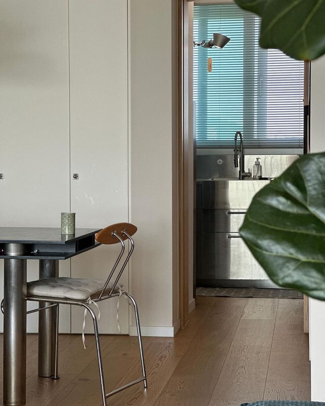 의자의 소재와 특성이 너무 다 달라 혼란스러워 보일 수 있는 상황이었는데, 식탁을 검은색 상판과 스틸 다리로 구성된 심플한 디자인으로 두니 다 품어주더라고요. 식탁이 중심을 잘 잡아주는 느낌이에요.