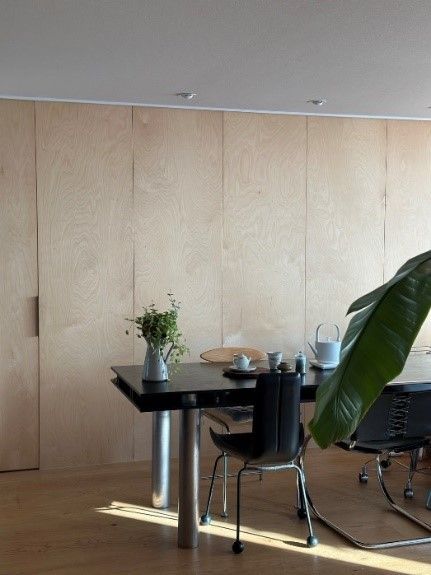 거실 한쪽 벽면을 자작나무 합판으로 선택한 이유는 그 자체로도 따뜻한 질감과 자연스러움을 지니고 있어서예요. 마감해야 할 벽면은 5.4m에 달했는데요. 한 판으로 마감하면 너무 단조로워 보일 것 같아 전체 벽 길이를 균등하게 나눠 잡았어요. 빈 벽에 남아 있던 거푸집 흔적의 비율이 유난히 마음에 들어 그대로 디자인에 반영한 부분도 있고요.