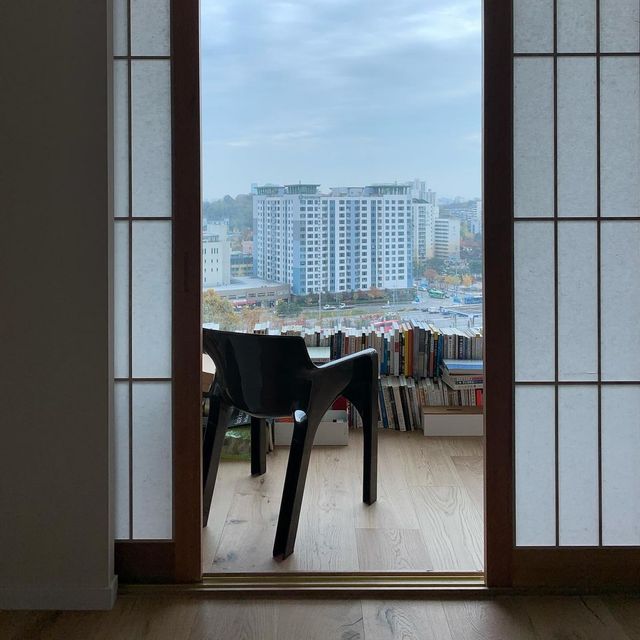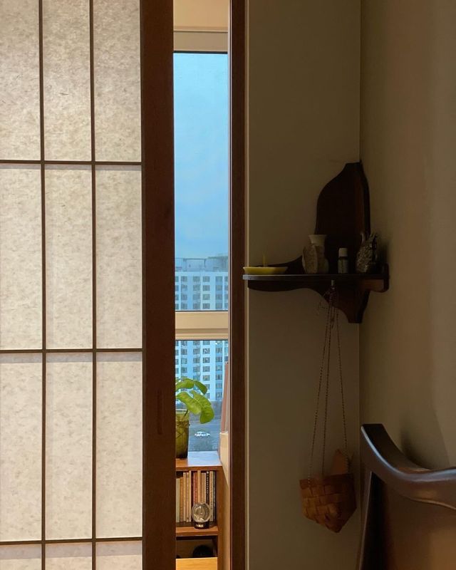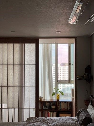 발코니를 확장해 안방의 면적을 키우기보다는 서재로 활용해보고 싶다는 생각에 창호지로 마감한 목재 미닫이문을 설치해 공간 분리를 시도했어요. 빛이 아스라이 들어오는 점, 공간이 명확히 구분되는 점, 커튼을 설치하지 않아도 빛의 양도 적절히 조절되는 점 등 덕분에 꽤나 만족스러운 결과물이었죠. 무엇보다 미닫이문을 열 때 나는 드르륵 소리가 묘하게 정겹고 아늑한 느낌을 더해주었고요.