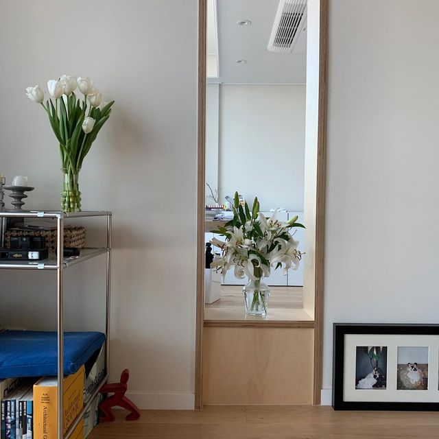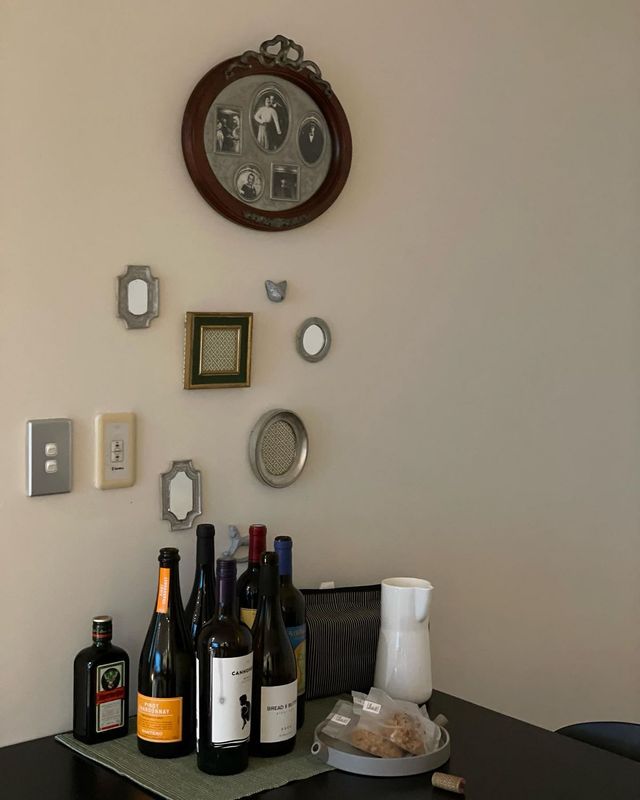 식탁 위 벽면에는 오래전에 구입한 Kiyo 작가님의 거울 작품과 빈티지 소품 숍에서 찾은 액자들을 함께 걸어 두었어요. 이 자리에서 지인들과 옹기종기 모여 샴페인 한 잔을 즐기는 걸 특히 좋아해요. 맑고 투명한 기포들이 만들어내는 설렘이 참 근사하거든요. 비록 와알못이지만 와인을 마시는 즐거움만큼은 놓치지 않으려 해요. 올 연말에는 홈파티를 계획 중인데, 그때는 위키드와이프(@wkd.seoul)를 이용해 볼까 해요.