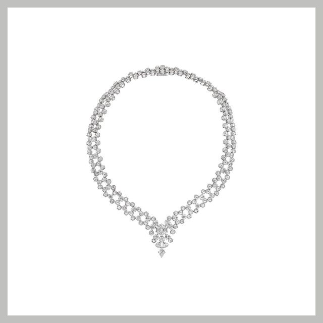 까르띠에 하이주얼리 네크리스는 결정화되는 눈송이에서 영감받아 탄생했습니다. 독특한 육각형 셰이프의 다이아몬드가 주를 이루며 특히 중심에 자리한 3.51 캐럿의 다이아몬드가 눈길을 사로잡습니다. 일정하게 반복되는 기하학적 모티브와 정교한 라인, 메종의 장인정신을 엿볼 수 있는 오픈 워크 기법을 적용해 소장 가치를 높였습니다.