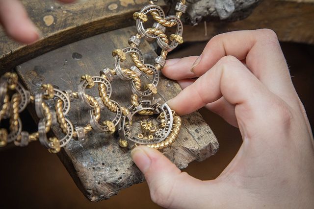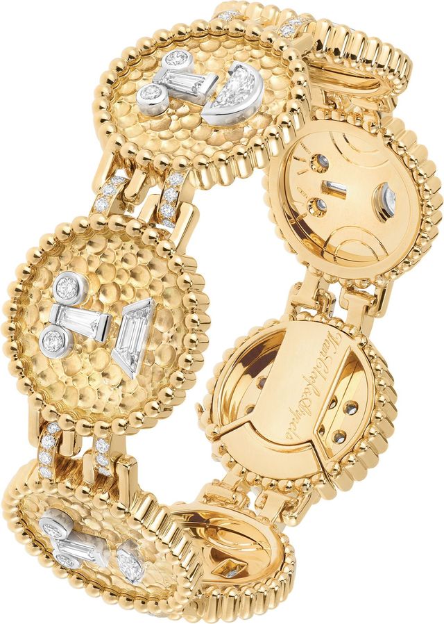 1933년 특허를 받은 메종의 시그너처 미스터리 세팅 기법은 이번 작품에서도 빛을 발한다. 메탈 마운트를 감춘 정교한 젬스톤 세팅으로, 에메랄드로 표현된 야자수 잎사귀는 마치 벨벳처럼 부드럽게 펼쳐진다. 줄기는 로즈 골드에 섬세한 조각 기법으로 새겨 생동감 있게 표현했다. 폴리싱, 해머링, 가드룬 작업을 거쳐 탄생한 반짝이는 골드 비즈는 메종 장인들의 탁월한 기술력을 여실히 보여준다.
