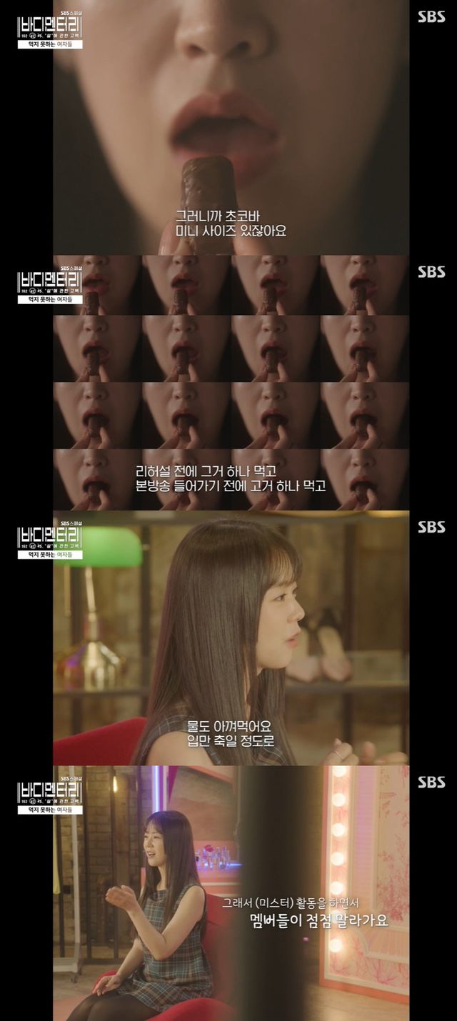 그러면서 그는 "이게 아무리 사람이 말라도 안에 장기가 들어있으니 먹으면 (배가) 나온다. 그러니까 초코바 미니 사이즈를 리허설 전에 하나 먹고 본방송 들어가기 전에 그거 하나 먹는다. 물도 입만 축일 정도로 아껴먹는다. 그래서 (미스터) 활동을 하면서 멤버들이 점점 말라간다. 연습생 때 했던 것보다 더 절식했다"고 밝히며 충격을 자아냈다.