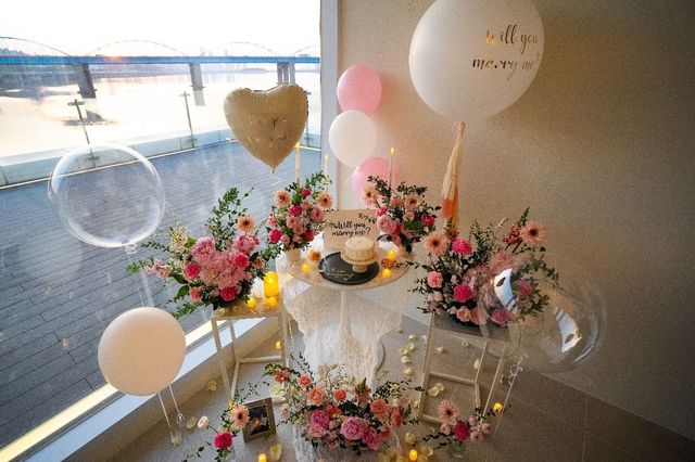 추가 옵션으로는 레터링 화이트 무스 케이크, 대형 꽃다발, 레터링 대형 헬륨 풍선, 반지와 목걸이를 담을 수 있는 플라워 박스, 스크린 영상 상영, 꽃길 연출 등이 준비돼 있다.