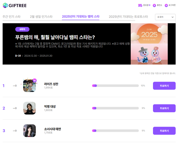 이처럼 2025년 을사년을 빛낼 스타들에 대한 관심이 집중되는 가운데 팬들을 위한 특별한 소식이 전해졌다. 신개념 팬 투표 서비스인 '기프트리'는 시즌 투표인 '2025년이 기대되는 뱀띠스타'의 후보를 공개했다. 이번 투표는 12월 30일부터 1월 30일까지 진행되며, 1위를 차지한 스타에게는 풍성한 혜택이 제공될 예정이다.