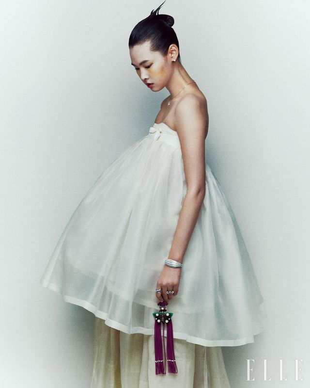 Tchai Kimyoungjin.이너 웨어로 레이어드한 치마와 손에 든 노리개는 모두