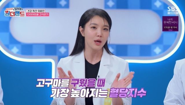 그런 의뢰인이 하는 운동은 줄넘기. 그러나 권준연 전문의는 “도움이 되는 건 맞는데, 의뢰인은 무릎이 망가질 수 있다”라며 고도비만, 퇴행성 관절염이 있는 이들에겐 실내 자전거나 수영, 아쿠아로빅 등 관절 부담을 최소화할 수 있는 운동을 추천했다. 의뢰인은 밥 대신 군고구마를 섭취했지만, 이 전문의는 “고구마는 조리법에 따라 혈당지수가 크게 차이 난다”면서 군고구마가 혈당지수가 가장 높다고 밝혔다.