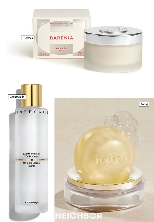 에르메스 바레니아 퍼퓸드 바디 크림은 피부에 빠르게 흡수되어 촉촉하게 마무리된다. 브랜드 첫 시프레 향수인 바레니아 오 드 퍼퓸과 함께 사용하면 감미로움은 배가될 것이다. 피부 광채를 충전하고 싶다면 샹테카이 24K 골드 에센스 인텐스를 주목할 것. 24K 골드와 골드 비타민 성분을 함유해 화이트닝 케어에 탁월하다. 맑고 깨끗한 피부를 위한 첫걸음은 클렌징이다. 뽀아레는 싸봉 뿌흐 르 비싸쥐를 제안한다. 섬세하고 부드러운 마이크로 거품이 모공 깊숙이 쌓인 각종 노폐물과 미세먼지를 말끔하게 씻어낸다. 고급스러운 케이스에 담겨 선물용으로 제격.