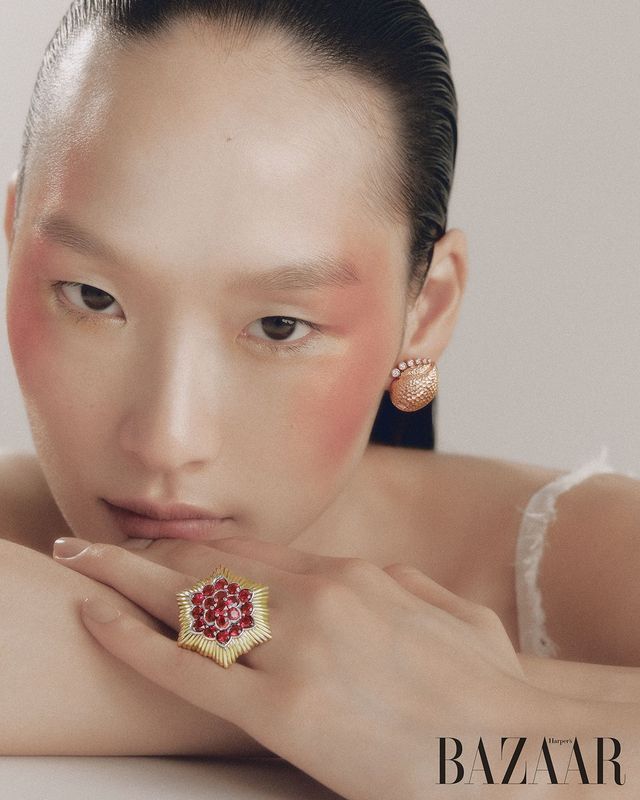 로즈 골드 소재에 다이아몬드를 세팅한 ‘트레저 드 라 플라쥬’ 이어링, 19개의 루비를 장식한 ‘주아요 드 라고스’ 링은 Van Cleef & Arpels.