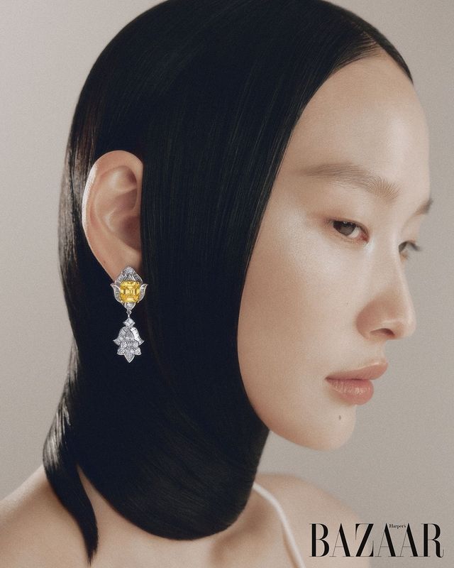 에메랄드 컷 오렌지 옐로 다이아몬드를 중심으로 캘리브레이티드·스퀘어·페어·라운드 컷 다이아몬드를 세팅한 ‘뤼미에르 드 위다이푸르’ 이어링은 Van Cleef & Arpels.