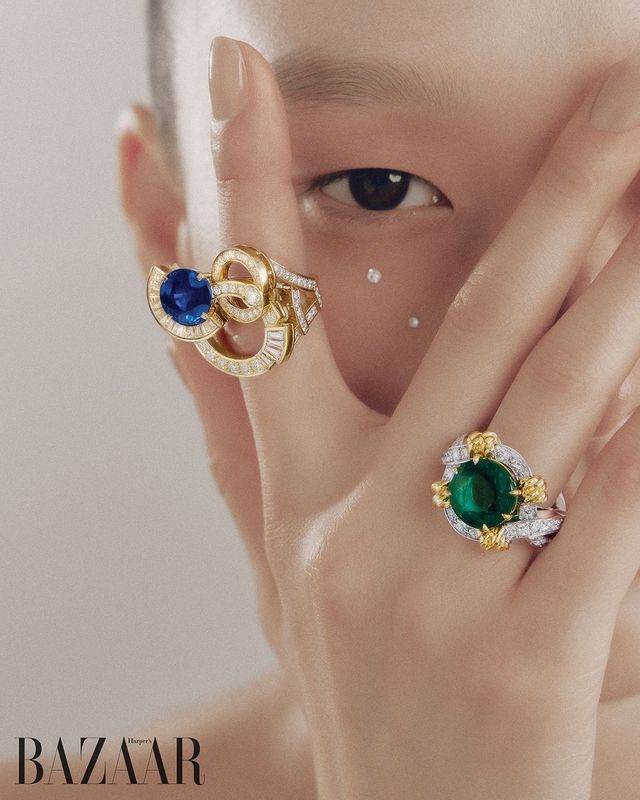 옐로 골드 소재 링을 따라 라운드 컷 사파이어와 다이아몬드를 장식한 ‘르가르 베르 르 시엘’ 링, 라운드 컷 에메랄드가 돋보이는 ‘불린 드 에메로드’ 링은 Van Cleef & Arpels.