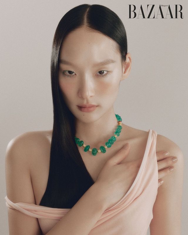 다양한 길이로 변형가능한 총 356.94캐럿에 달하는 에메랄드 비즈 57개와 루비, 진주, 다이아몬드를 세팅한 ‘캅 코모린’ 네크리스는 Van Cleef & Arpels.