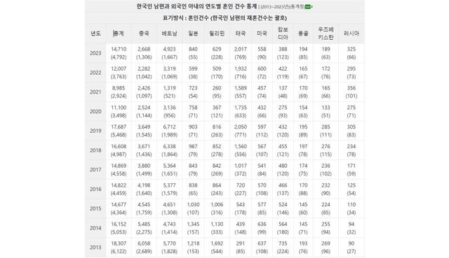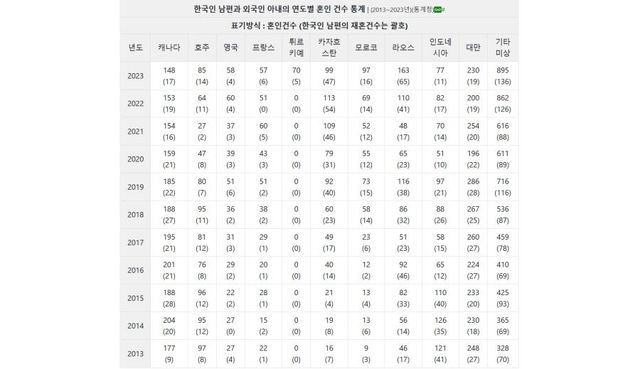 2023년 국내결혼이 17만건~18만건이니 교포 포함해도 서양국가들과의 결혼은 적은편