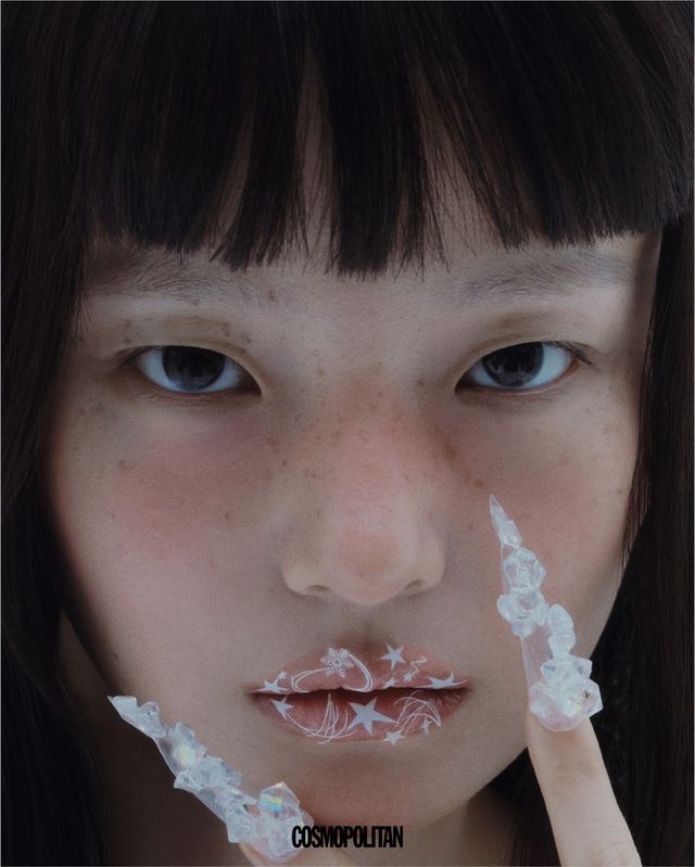 얼음 속 은하수를 담은 듯한 입술 표현이 포인트인 만큼 흰색 별 모양 스티커를 붙이고 투명 립글로스를 두껍게 덧발라 얼음 조각처럼 반짝이는 효과를 만든다. 여기에 고드름을 닮은 네일까지 더하면 몽환적인 무드가 극대화된다. 투명한 네일 팁에 깨진 얼음 형태의 비즈를 비정형으로 올려준 뒤 미러 파우더를 부분적으로 발라 얼음 결정이 반짝이는 듯한 디테일을 표현한다. 나비존과 눈두덩에 주근깨를 그려넣고, 레드와 오렌지색 블러셔를 믹스해 치크부터 눈 앞머리, 콧대까지 ‘W’ 형태로 발라 생기와 따스함을 불어넣는다.