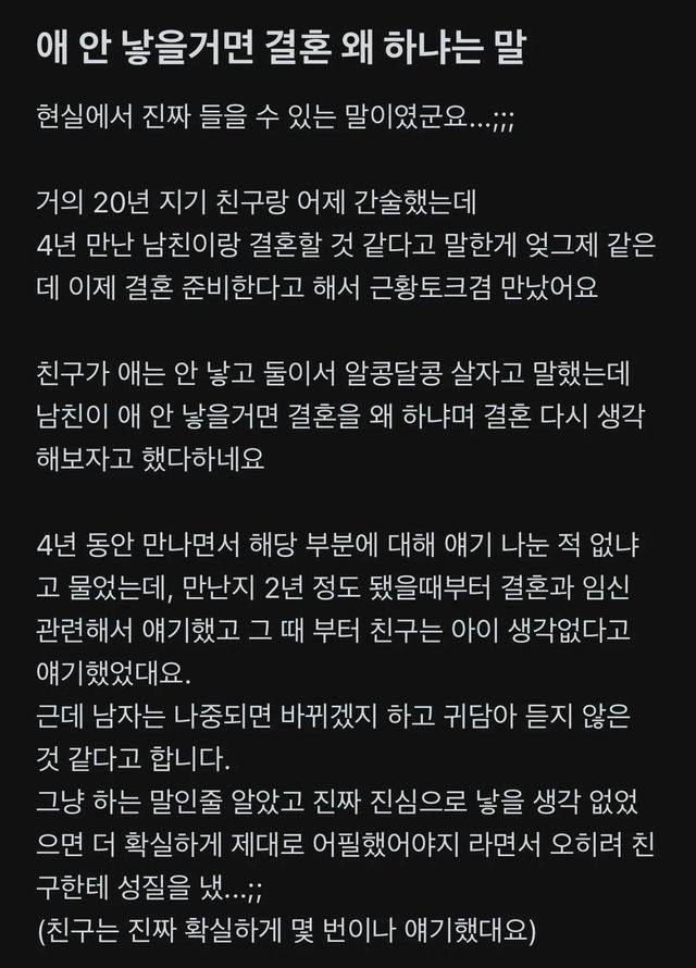 남자입장에선 애 안낳을꺼면 결혼 할 이유가 없지 않나?
