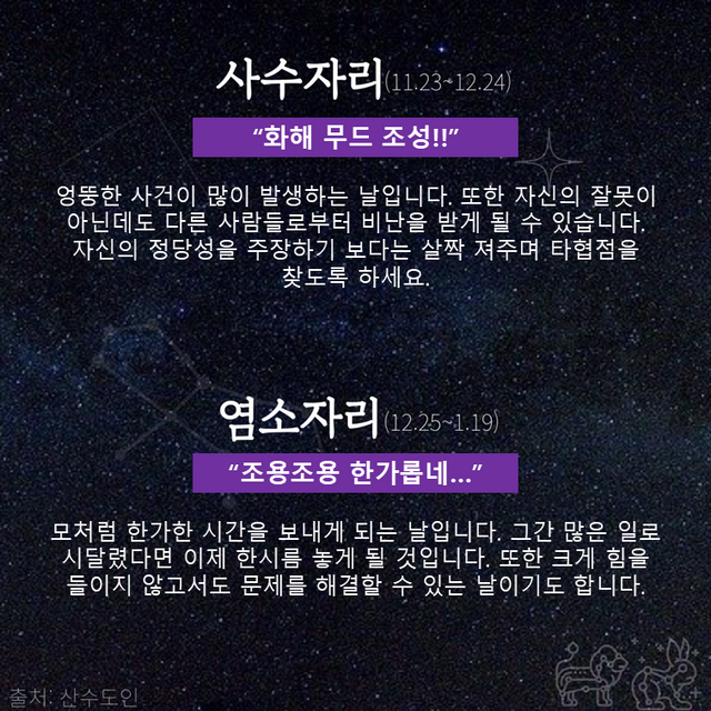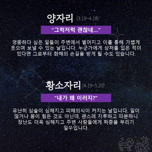 유난히 심술이 심해지고 피해의식이 커지는 날입니다. 일이 많거나 몸이 힘든 것도 아닌데, 괜스레 지루하고 따분하니 장난도 더욱 심해지고 주변 사람들에게 짜증을 부리기 일쑤입니다.
