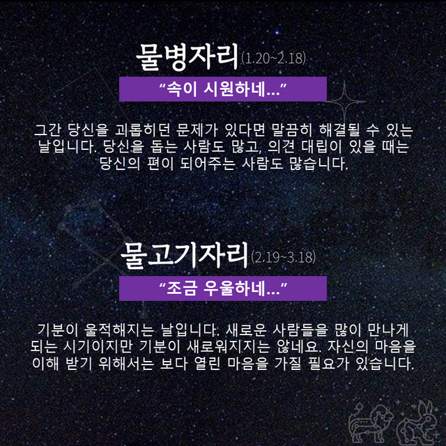 애정운은 나쁘지 않습니다. 싱글인 분이라면 신비로운 분위기의 상대방을 만나게 될 수 있습니다. 조금 다른 사람이라고 해서 겁을 먹지 말고 당신의 마음을 정확하게 보여주시면 좋겠네요.