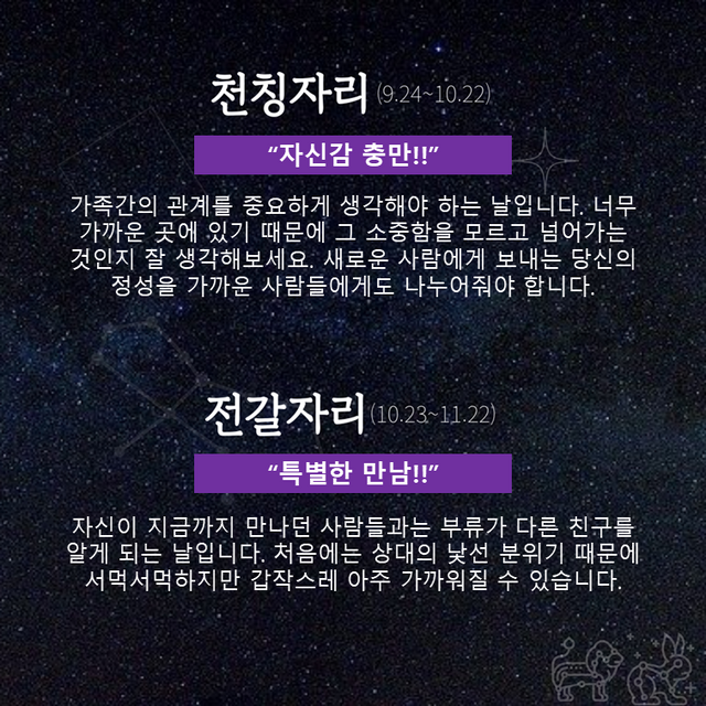 경제적으로 아주 풍족한 날은 아닙니다. 하지만 오늘 당신을 위해 어느 정도 투자를 하는 것은 이후의 자신을 위해서 필요한 일입니다. 자기 자신을 가꾸는 데에 지출을 아끼지 마세요.