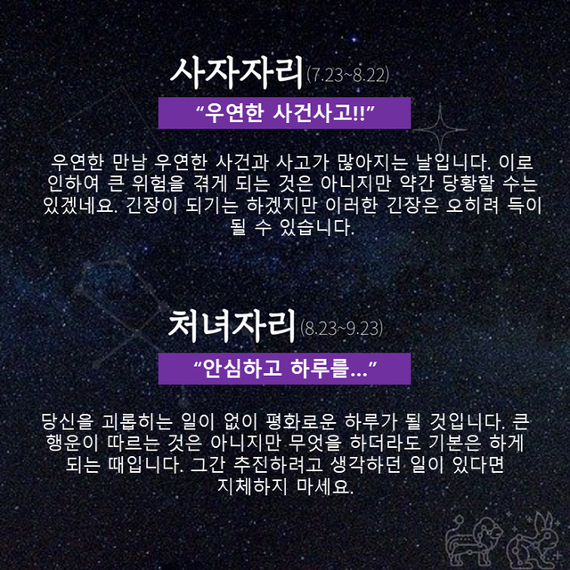 우연한 만남 우연한 사건과 사고가 많아지는 날입니다. 이로 인하여 큰 위험을 겪게 되는 것은 아니지만 약간 당황할 수는 있겠네요. 긴장이 되기는 하겠지만 이러한 긴장은 오히려 득이 될 수 있습니다.