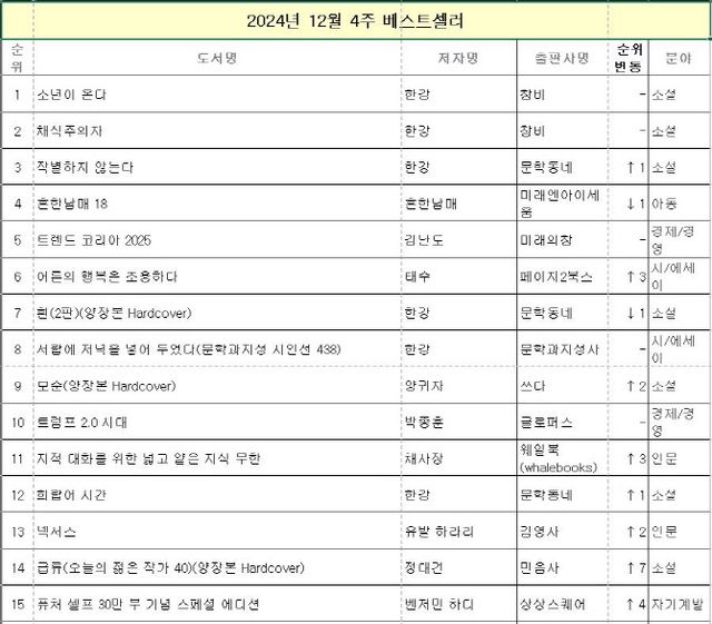교보문고가 3일 발표한 2024년 12월 4주차 베스트셀러 집계에 따르면 ‘소년이 온다’는 종합 1위에 올랐다.