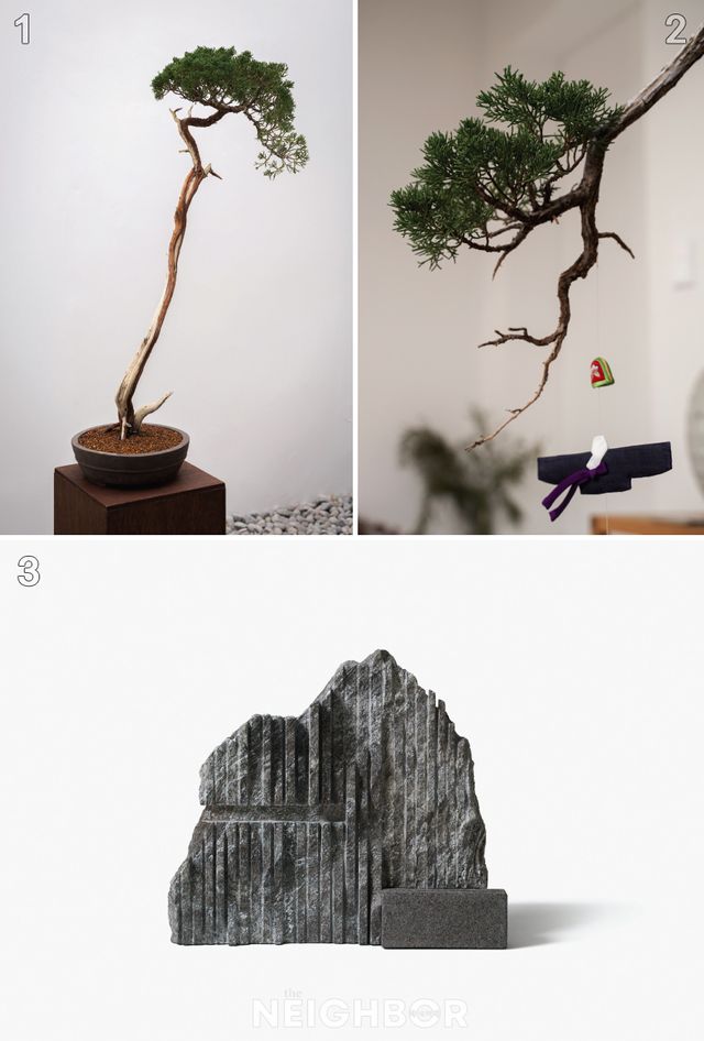 1 전시 중인 분재 작품. 2 다양한 분재 장식. 3 김현주, Landscape 2021_3, 2021, Stone.