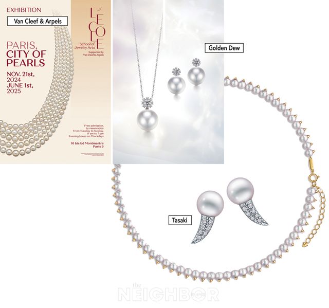 우아한 진주 주얼리의 세계로 우리를 안내해줄 주얼리 아이템과 전시를 소개한다. 아코야 진주에 가시 디테일이 특징인 타사키의 ‘데인저 컬렉션’, 골든듀의 ‘프리티 레이디 남양진주 이어링과 네크리스’는 진주와 다이아몬드를 결합한 디자인으로 일상 속 고급스러운 무드를 연출하기 좋다. 반클리프 아펠이 후원하는 레콜 주얼리 스쿨에서 개최한 <파리, 진주의 도시> 전시는 19세기 후반부터 이어지는 주얼러들의 역사를 조명한다. 2025년 6월 1일까지 프랑스 파리 레콜 주얼리 스쿨 그랑 불르바르 캠퍼스에서 진행된다.
