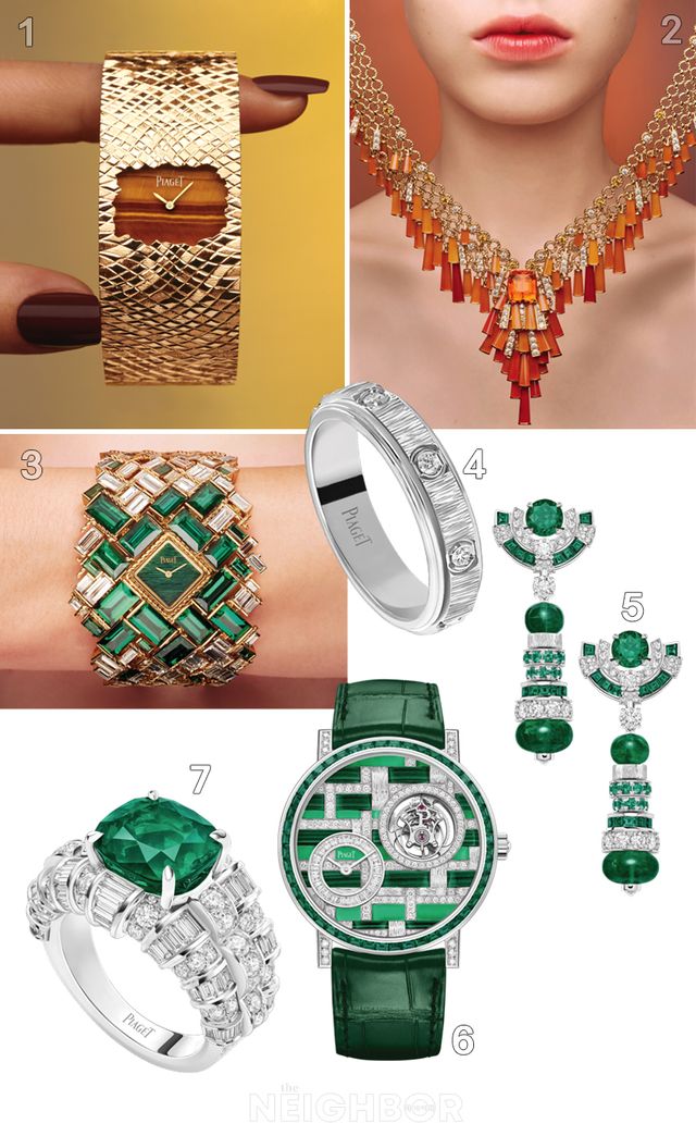 1 타이거 아이 다이얼이 돋보이는 핑크 골드 커프 워치. 2 사다리꼴 컷 카닐리언, 스페사르타이트 가닛, 3 옐로 골드 위를 장식한 다양한 크기의 바게트 컷 에메랄드가 매혹적인 엠브로이더드 커프 워치. 4 데코 팰리스 인그레이빙 마감 처리한 화이트 골드 밴드에 8개의 브릴리언트 컷 다이아몬드를 세팅한 포제션 링. 옐로 사파이어, 다이아몬드를 그러데이션으로 표현한 대담한 디자인의 핑크 골드 네크리스. 5, 6, 7 화이트 골드에 에메랄드와 다이아몬드를 정교하게 세팅한 글로잉 위브 이어링, 링, 워치.