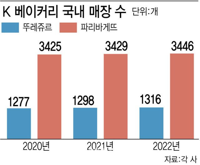 파리바게뜨는 뚜레쥬르보다 해외 진출 시기가 다소 늦었음에도, 속도와 폭에서 앞섰다. 현재 파리바게뜨는 중국(349개), 미국(197개), 프랑스(6개), 영국(3개), 캐나다(10개), 베트남(10개), 싱가포르(21개), 캄보디아(3개), 인도네시아(13개), 말레이시아(10개), 필리핀(2개) 등 11개국에서 총 624개 매장을 운영하고 있다. 3개국은 양해각서(MOU)를 체결해 올해 매장을 오픈할 예정이다. 반면 뚜레쥬르는 미국, 중국, 캐나다, 인도네시아, 베트남, 몽골, 캄보디아 등 7개국에서 총 560개 점포를 운영하고 있다. 유럽에 매장이 없는 대신 북미(150개)과 아시아(410개)에 주력한다.
