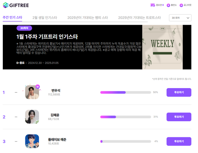 1월 6일부터 진행되는 1월 2주차 기프트리 인기스타에서는 기사를 작성하고 있는 시점을 기준으로 8,197표를 획득한 김혜윤이 1위를 차지하고 있으며 그 뒤를 이어 변우석이 5,673표, 지드래곤이 4,319표로 각각 2위, 3위를 차지하고 있다.