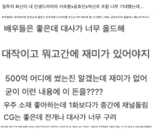 500억 원이라는 막대한 제작비가 투입된 만큼, 화려한 시각적 효과와 우주라는 신선한 배경을 활용해 이야기의 전개를 더욱 매력적으로 풀어나갈 필요가 있다.