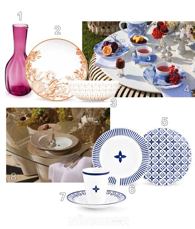 1 무라노섬의 베네치아 장인이 제작한 우아한 실루엣의 플라워 카라프. 2, 3 오렌지 컬러의 열대 꽃과 산호, 불가사리를 표현한 LV 바이 더 풀 컬렉션 플레이트와 볼. 4 13개의 테이블웨어로 구성해 꽃, 별, 꽃잎의 디자인 요소를 담아낸 콘스텔레이션 컬렉션. 5, 6 모노그램 플라워 타일 사이드 플레이트 세트 모두 가격 미정. 7 모노그램 플라워 패턴의 커피잔과 소서. 8 스플렌더 컬렉션. 모두 가격 미정.
