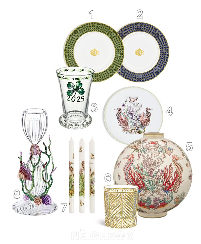 1, 2 프랑스 리모주 지방의 포슬린으로 제작한 그린, 블루 컬러의 디너 플레이트. 3 2025년을 맞이해 행운을 상징하는 네잎클로버를 그려 넣은 워터 글라스. 4 컬러풀한 바닷속 세계를 시적으로 그려낸 디저트 접시. 5 에나멜 공법으로 유명한 도자기 공방 ‘에모 드 롱위’ 매뉴팩처와 협업해 리미티드 에디션으로 선보이는 화병. 6 셰브론 패턴을 핸드 인그레이빙한 크리스털 위스키 글라스. 7 해마와 나비, 산호를 새긴 캔들. 8 산호와 조개를 입체적으로 표현해 하나의 예술 작품을 연상시키는 캔들 홀더. 모두 가격 미정.