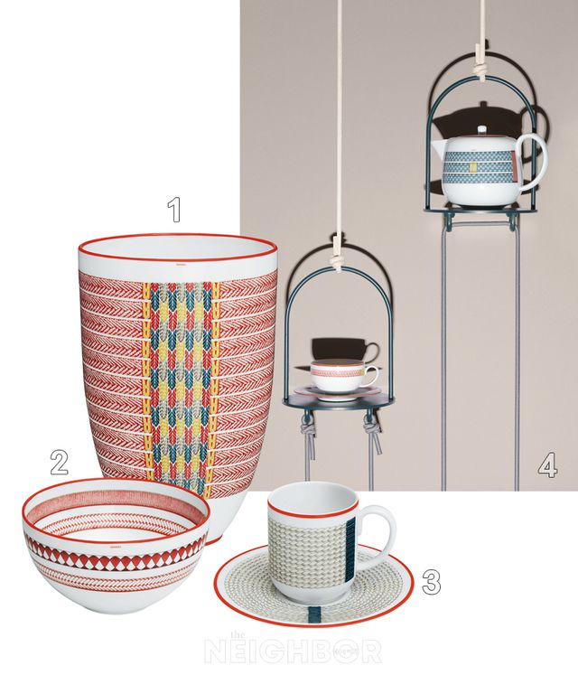 에르메스 ‘트레사주 에퀘스트르’ 컬렉션은 메종의 시작이 된 마구 제작에 쓰인 장식과 브레이딩 기법을 모티프로 면과 가죽 실이 서로 얽혀 있는 섬세한 디자인을 담았다. 새롭게 선보이는 형태인 할로 플레이트 10개를 비롯해 총 27개의 제품으로 구성한 컬렉션은 포슬린의 기본이라 불리는 카올린 화이트를 사용해 아티스트 비르지니 자맹의 섬세한 패턴 디자인을 돋보이게 한다.