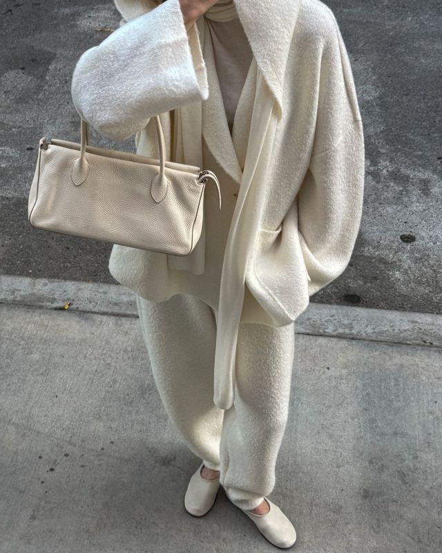 사라의 룩이 평범하지만 결코 지루하지 않은 건 어깨에 두른 화이트 니트와 바라클라바 덕분이죠.
