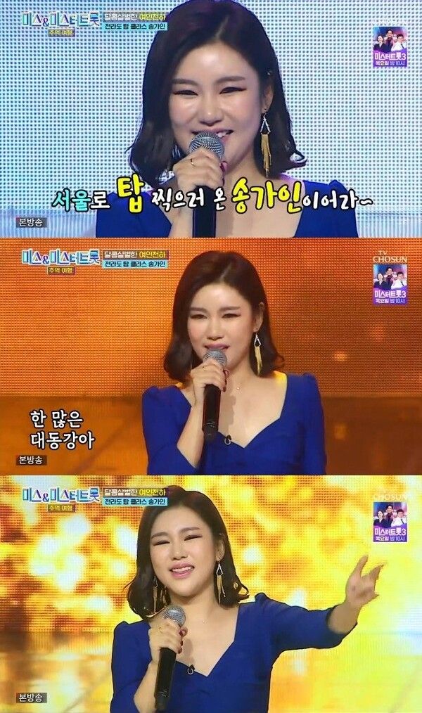 "전라도에서 탑 찍어불고, 서울로 탑 찍으러 온 송가인이어라"라는 자신감 넘치는 소개와 함께 시작된 무대는 시청자들에게 깊은 인상을 남겼다. 송가인의 '한 많은 대동강'은 정통 트로트의 진수를 보여주며 시청자들의 심금을 울렸고, 예심 진으로 선정되며 '미스트롯' 최종 진의 영광까지 안았다.