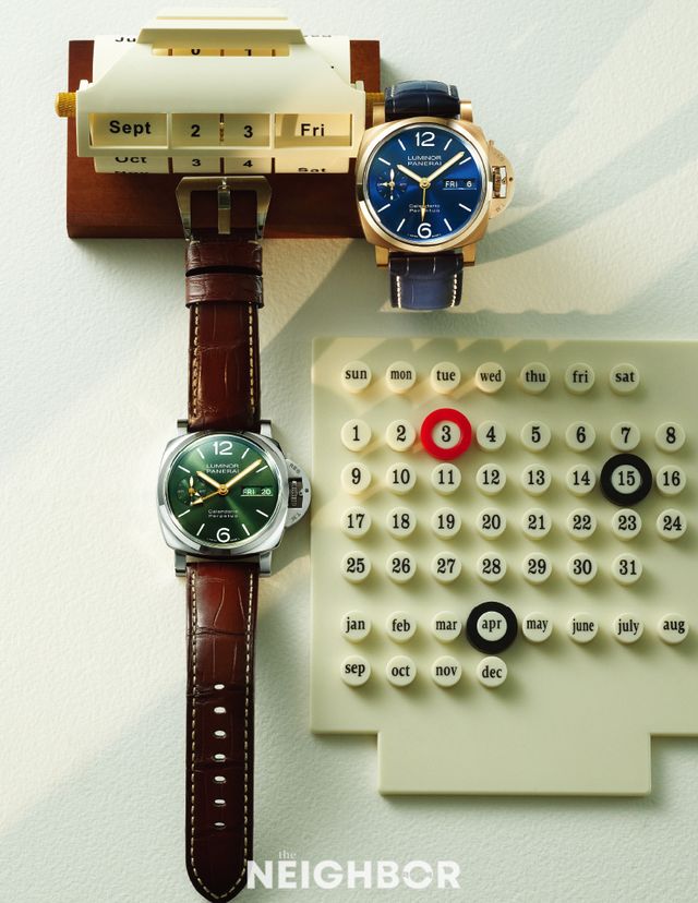Panerai 윤년을 자동으로 계산하는 루미노르 퍼페추얼 캘린더 GMT 워치. P.4100 칼리버를 장착해 3일간의 파워리저브를 보장하며, 3시 방향에 날짜와 요일창을, 9시 방향에 스몰 세컨즈 및 24시간 인디케이터를 배치했다. 왼쪽 모델은 플래티넘테크™ 소재 케이스와 그린 선브러시드 다이얼에 브라운 레더 스트랩을 더했다. 오른쪽 모델은 파네라이가 자체 개발한 골드테크™ 소재 케이스와 블루 선브러시드 다이얼에 블루 레더 스트랩을 매치했다. 각각 9천8백만원대, 7천1백만원대.