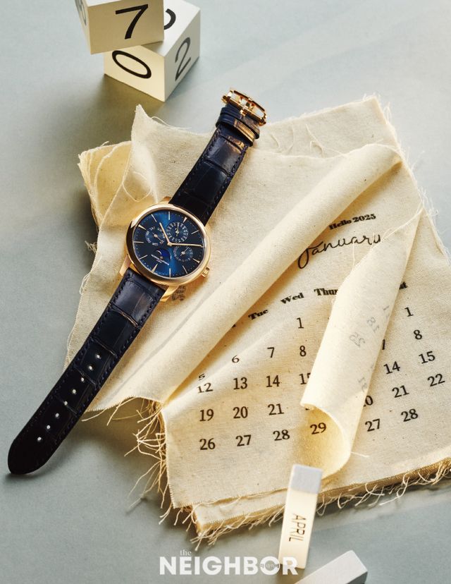 Vacheron Constantin 핑크 골드 케이스와 선버스트 새틴 마감 처리한 미드나이트블루 다이얼의 조화가 우아한 패트리모니 퍼페추얼 캘린더 울트라-씬 워치. 두께가 4.05mm에 불과한 울트라 슬림 오토매틱 무브먼트로 구동하며 2100년까지 별도의 조정 없이 정확한 시간 측정이 가능하다. 특히 샹르베 에나멜링으로 표현한 밤하늘과 수공 마감 처리한 달이 어우러진 문페이즈 창이 아름답다. 1억3천만원대.