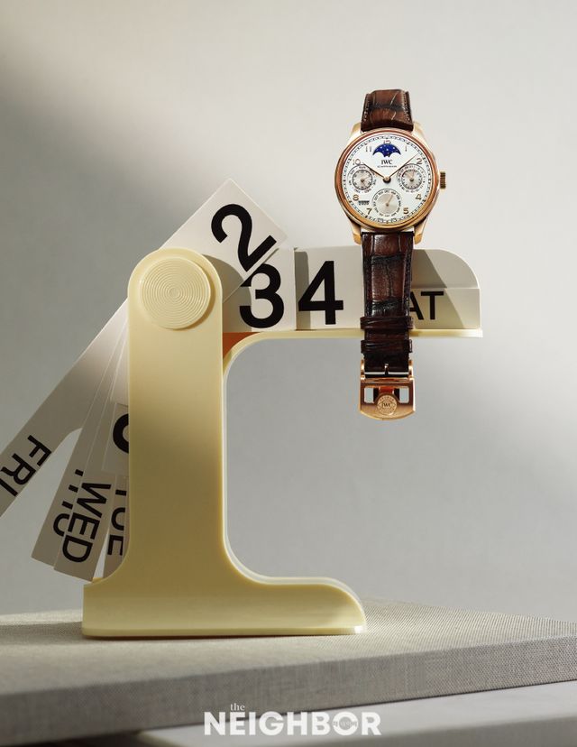 IWC 지름 44.2mm의 레드 골드 케이스에 인하우스 자동 칼리버 5200을 탑재한 포르투기저 퍼페추얼 캘린더 워치. 다이얼 12시 방향에 배치한 문페이즈 창이 실제 달의 주기를 보여주며, 연도, 날짜, 요일, 월 모두 직관적인 디스플레이를 통해 한눈에 확인할 수 있다. 5천8백만원.