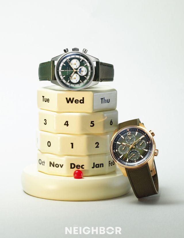 (위부터) Zenith 0.1초까지 측정 가능한 오토매틱 엘 프리메로 컬럼-휠 크로노그래프를 장착한 크로노마스터 오리지널 트리플 캘린더 워치. 스틸 케이스 지름은 38mm로 6시 방향에 문페이즈를 결합한 60분 카운터, 3시와 9시 방향에 각각 60초 카운터와 스몰 세컨즈가 자리한다. 세련된 올리브그린 컬러 다이얼 위로 균형 있게 배치한 별도의 창을 통해 날짜와 요일, 월을 확인할 수 있다. 2천86만원.