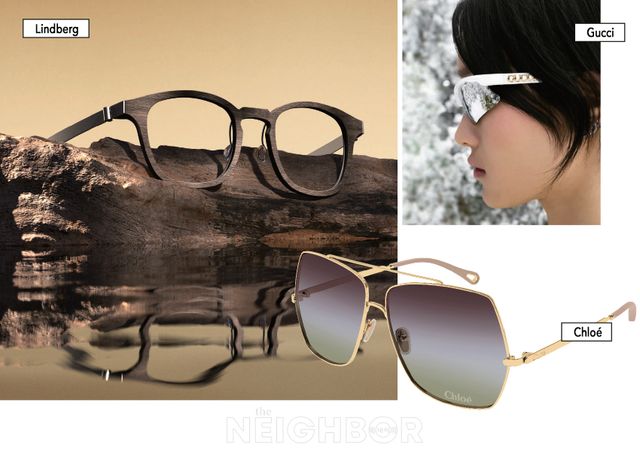 특별한 소재와 형태를 지닌 아이웨어를 소개한다. 린드버그에서 전 세계 500개 한정으로 출시한 오크 스페셜 에디션은 6000년 된 오크나무 소재에 브랜드의 독보적인 아이웨어 제작 기술을 접목했다. 구찌는 마스크형 프레임의 독특한 실루엣을 지닌 선글라스를, 끌로에는 메탈 소재의 더블 브리지 디자인이 특징인 선글라스를 선보인다.