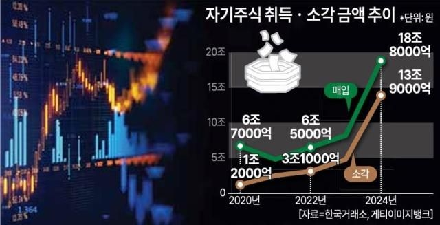 9일 한국거래소에 따르면 지난해 국내 상장사의 자사주 매입 규모는 2023년 8조2000억원에서 10조6000억원 늘어난 18조8000억원이었다. 전년 대비 2.3배 급증한 수준이다. 거래소 시스템상 관련 데이터가 존재하는 2009년 이후 최고치다.