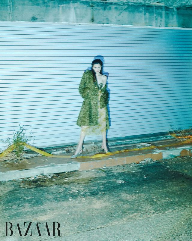 시어링 퍼 코트는 Burberry. 슬립 드레스는 Gucci. 드롭 귀고리는 24만원 Favv. 슬링백 힐은 Celine by Hedi Slimane.