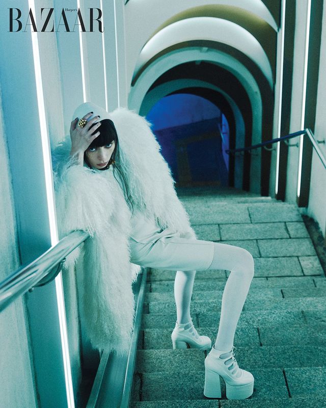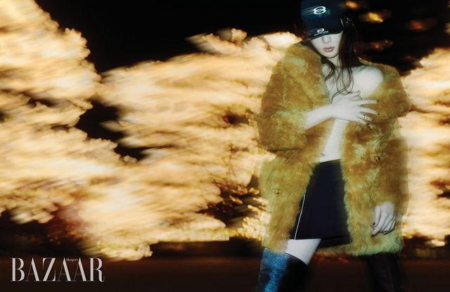 시어링 퍼 코트, 스커트는 Celine by Hedi Slimane. 볼캡은 Balenciaga. 이어 커프는 Givenchy. 반지는 Chrome Hearts. 사이하이 부츠는 Fendi.