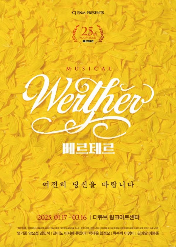 25주년을 기념해 5년 만에 돌아온 이번 공연에서는 2002년부터 베르테르 역을 가장 오래 맡아온 엄기준. 또, 롯데 역으로 열연을 펼친 전미도와 이지혜를 비롯해, 양요섭과 김민석, 류인아가 신규 멤버로 함께한다. YES24DAY 특별 선물과 후기 이벤트도 준비됐다.