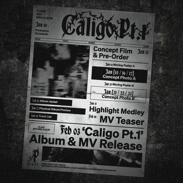 공개된 이미지는 자욱한 안개가 깔린 어두운 골목길을 배경으로 신비롭고 서늘한 분위기를 연출했다. 그 위로는 세 번째 미니앨범 'Caligo Pt.1'의 타이틀과 함께 발매일시인 '2025.02.03. 6PM(KST) RELEASE'가 표기되어 본격적인 컴백 카운트다운의 시작을 알렸다.