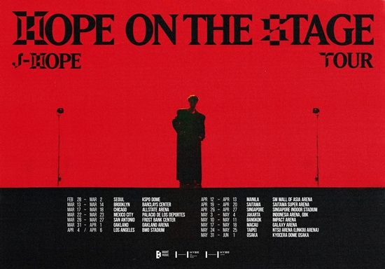 'HOPE ON THE STAGE'는 제이홉이 처음으로 여는 솔로 월드투어다. 제이홉은 오는 2월 28일부터 3월 2일까지 서울 송파구 KSPO DOME을 시작으로 브루클린, 시카고, 멕시코 시티 등 북미를 비롯해 마닐라, 사이타마, 싱가포르, 자카르타, 방콕, 마카오, 타이베이, 오사카까지 총 15개 도시에서 전 세계 팬들과 만난다.