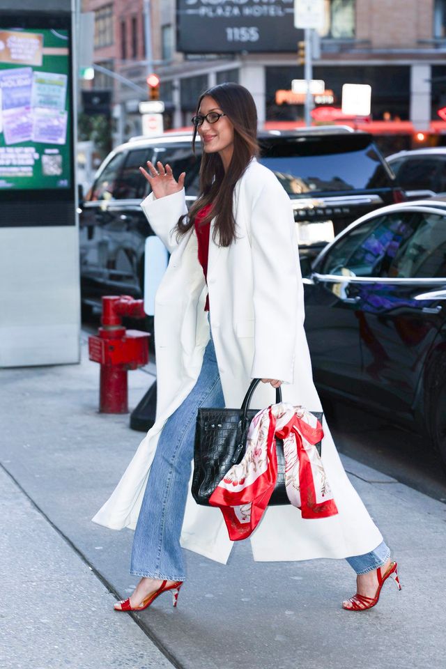 벨라 하디드는 발목까지 길게 내려오는 오버사이즈 화이트 코트를 입고 맨해튼 거리에 등장했습니다. 청량한 데님의 컬러와 매치하기 좋은 미니멀한 디자인의 화이트 코트에 톱과 슈즈, 그리고 가방의 스카프를 레드 컬러로 통일해 화사한 무드를 끌어올렸죠.