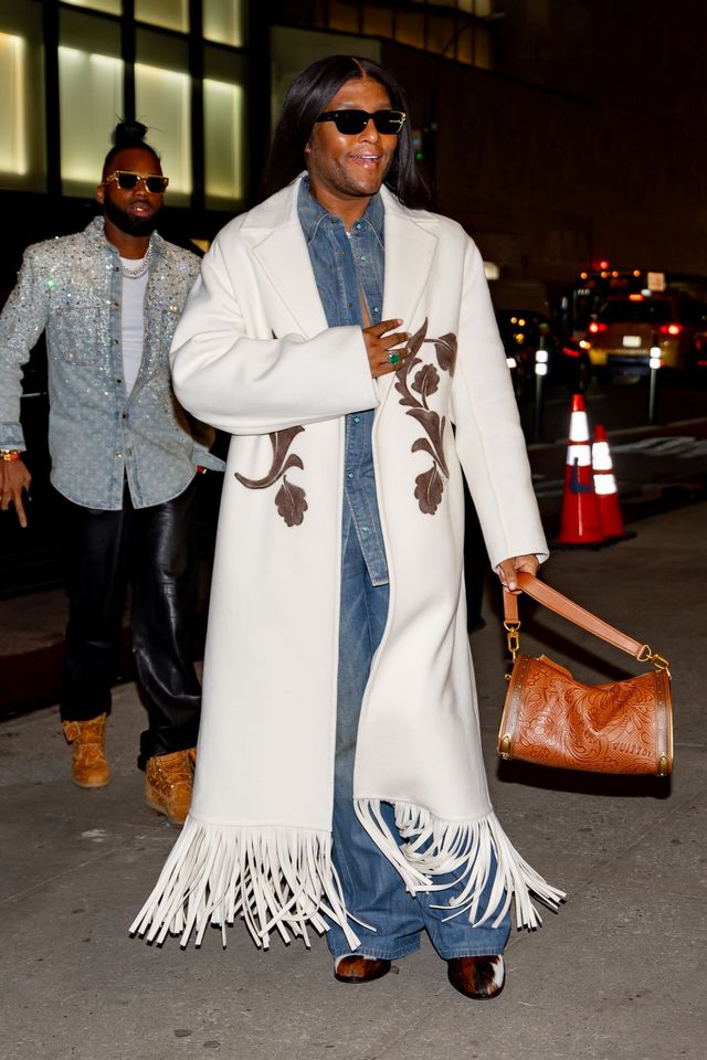 로치는 비범한 퍼스널 스타일로도 잘 알려져 있는데요. 드라마틱한 스타일링을 좋아하는 그는 프린지 장식이 달린 롱 화이트 코트에 데님 셋업을 매치해 과감하고 이국적인 룩을 완성했어요.