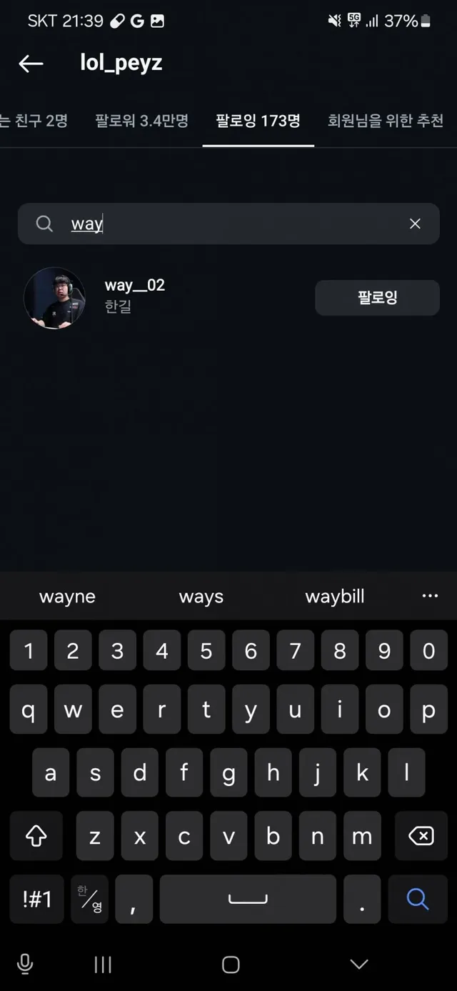 현 젠지 원딜 “페이즈”가 kt 2군서폿 “웨이”를 팔로우한게 확인됨