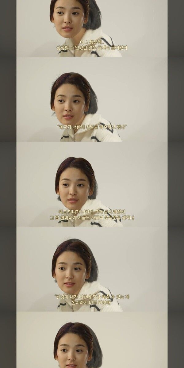 이어 그는 “송혜교 언니에게 도움을 청할 새도 없이 고향에 내려갔는데, 통장에 상상할 수 없는 큰 금액이 입금되어 있었다. 실장님께 물어보니 혜교 언니가 보내준 것이었다”고 말했다.